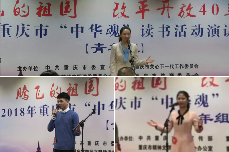 12月22日至23日,由重庆市委宣传部、市关工委、市文明办、市教委、市文化和旅游发展委、团市委等单位联合主办的2018年“中华魂”(腾飞的祖国——改革开放40年)主题教育活动演讲决赛在重庆市雾都宾馆举行,来自全市的340名选手参加了总决赛。演讲决赛分为小学、中学、青年三个组,其中小学组136人、中学组135人、青年组69人。开元叶静老师代表永川区关工委青年组、教育学院2017级学生周阳以及2016级学生杨吟代表重庆市教委关工委参加了决赛。