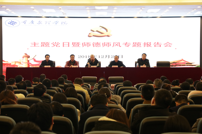 12月26日下午,学校举行主题党日暨师德师风建设专题报告会。在家校领导孙泽平、黄伟九、兰刚、漆新贵、万书辉,教学单位和科研机构全体教职工,教工部、教学部、科技部、学工部、党群部、纪检部全体员工,其他非教学单位科岗及以上人员、中共党员,共计1100余人参会。会议由党委副书记、校长黄伟九主持。