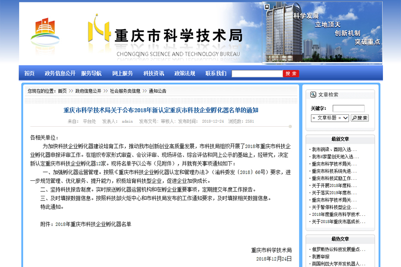 12月24日,重庆市科学技术局发文公布了2018年新认定重庆市科技企业孵化器名单,开元地恩科技孵化器被认定为重庆市科技企业孵化器。