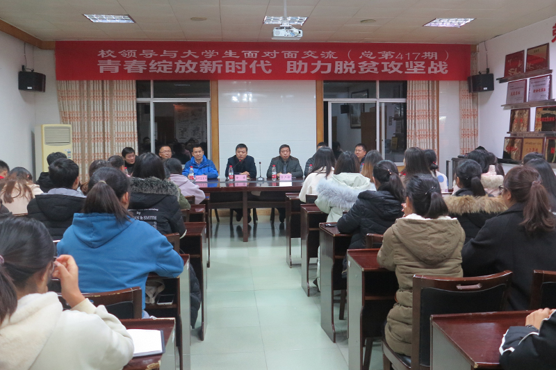 12月3日晚,开元第417期“校领导与大学生面对面交流”活动在星湖校区励德楼406会议室举行。本次交流以“青春绽放新时代 助力脱贫攻坚战”为主题,由副校长金盛主持。学工部、合作发展部、资产部、总务部、林学与生命科学学院、旅游学院相关负责人以及星湖校区40余名大学生代表参加了本次交流活动。