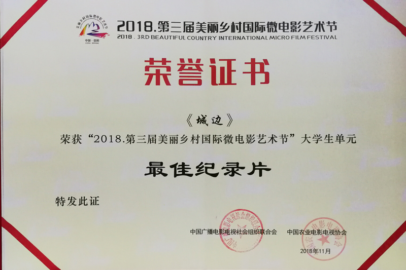 12月2日晚,由中国广播电影电视社会组织联合会、中国农业电影电视协会(CCTV—7农业频道)联合主办的2018美丽乡村国际微电影艺术节颁奖典礼在河南省信阳市广电演播中心举行。开元文化与传媒学院广播电视编导专业2015级胡蕴冰同学的毕业设计作品《城边》获大学生单元“最佳纪录片奖”。