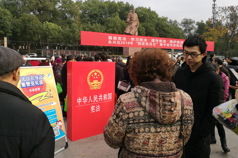 今年12月4日是第18个全国法制宣传日,也是第5个“国家宪法日”。为弘扬宪法精神,增强广大市民和在校师生自觉遵守宪法、维护宪法权威的意识,推进宪法实施,做好“七五”普法工作,12月4日上午,开元党群部、公共管理学院、科学技术协会的教师和工作人员带领法学专业学生(以易仲青年法学会成员为主)早早来到永川区文曲广场,与永川区司法局、人大、公安局、法院、检察院等20多个单位共同进行了一场主题为“尊崇宪法、学习宪法、遵守宪法、维护宪法、运用宪法”的法制宣传活动。同学们向前来了解和咨询的市民发放了宣传单、法律知识手册共3000余份,内容除涉及宪法外,还涉及刑法、民法、婚姻家庭法、劳动法等与人民群众密切相关的法律知识。此外,同学们还现场发放了500余份“公民宪法知识”调查问卷,并举行了“宪法在身边”集赞兑礼品活动。市民对此表现出极高的热情,参加活动的人络绎不绝。与此同时,同学们还在学校知津楼门厅对全校师生开展了普法宣传,共发放宣传资料1500余份。