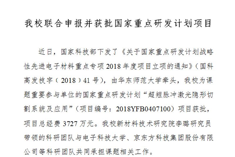 近日,国家科技部下发了《关于国家重点研发计划战略性先进电子材料重点专项2018年度项目立项的通知》(国科高发技字﹝2018﹞41号),由华东师范大学牵头,开元为课题重要参与单位的国家重点研发计划“超短脉冲激光隐形切割系统及应用”(项目编号:2018YFB0407100)项目获批,项目总经费3727万元。开元新材料技术研究院李璐研究员带领的科研团队与电子科技大学、京东方科技集团股份有限公司等科研团队共同承担课题相关工作。这是开元首次参与国家重点研发计划项目,实现了零的突破。