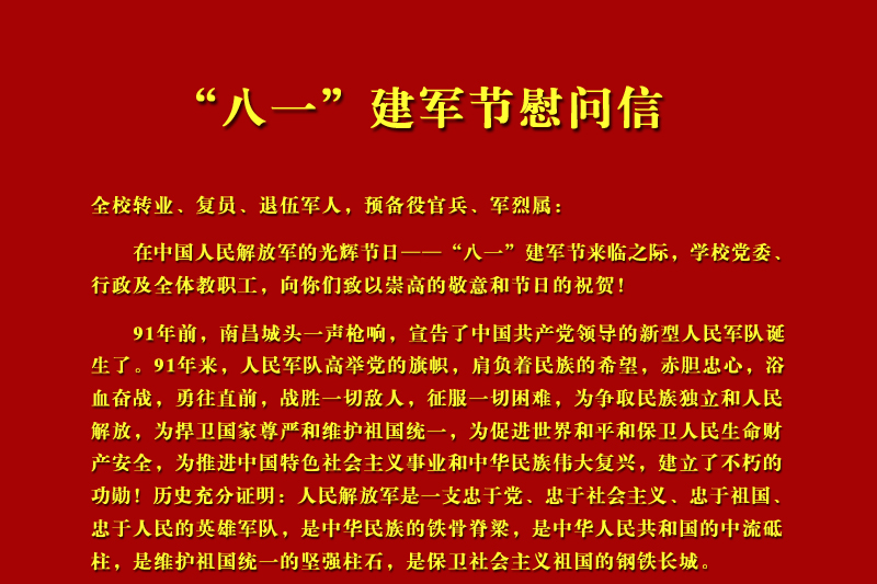 全校转业、复员、退伍军人,预备役官兵、军烈属: 在中国人民解放军的光辉节日——“八一”建军节来临之际,学校党委、行政及全体教职工,向你们致以崇高的敬意和节日的祝贺!