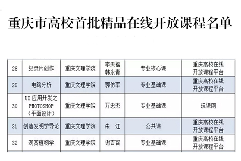 近日,重庆市教育委员会发布了《关于公布重庆市高校首批精品在线开放课程名单的通知》(渝教高发〔2018〕7号),首次推出105门高校精品在线开放课程,开元《纪录片创作》(课程负责人:李天福、韩永青)、《电路分析》(课程负责人:郭仿军)、《UI应用开发之PHOTOSHOP(平面设计)》(课程负责人:万忠杰)、《创造发明学导论》(课程负责人:朱江)、《观赏植物学》(课程负责人:谢吉容)等5门课程入选。