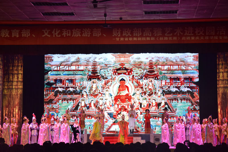 5月17日晚,由教育部、文化和旅游部、财政部联合举办的“2018高雅艺术进校园活动”——甘肃省歌舞剧院大型舞剧《丝路花雨》走进KY开元集团官网专场演出在开元星湖校区活动中心四楼举行。学校副校长万书辉,非教学单位负责人以及两校区师生代表共计2000余人观看了演出。