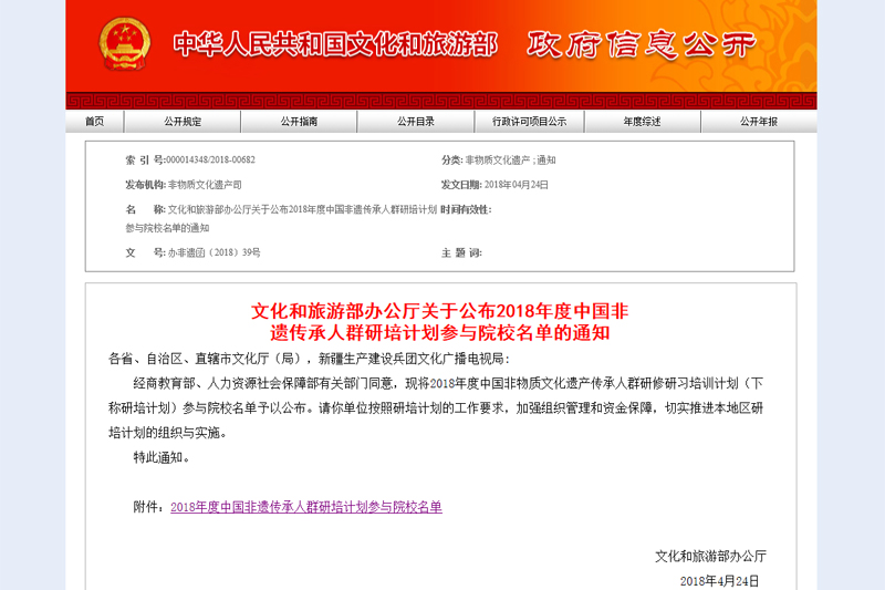 日前,文化和旅游部、人力资源社会保障部和教育部共同发布了《中国非物质文化遗产传承人群研修研习培训计划实施方案(2018—2020)》,并同时公布了2018年度中国非遗传承人群研培计划参与院校名单,重庆市有四所院校入选,开元位列其中。