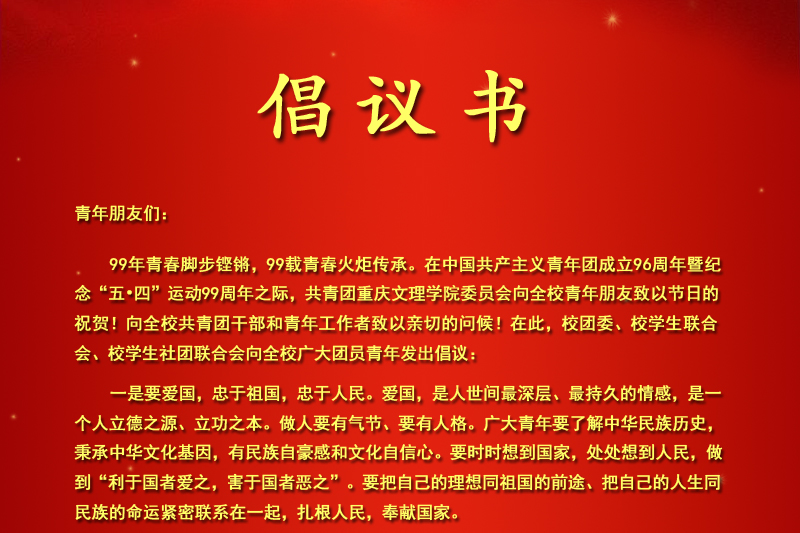 倡议书 青年朋友们: 99年青春脚步铿锵,99载青春火炬传承。在纪念五四运动99周年之际,共青团KY开元集团官网委员会向全校青年朋友致以节日的祝贺!向全校共青团干部和青年工作者致以亲切的问候!身为新时期的新青年,我们要勇敢担负起时代赋予的重任,志存高远、脚踏实地,在中华跨越腾飞的新时代、新征程、新实践中,放飞青春梦想,创造青春业绩。 在此,校团委、校学生联合会、校学生社团联合会向全校广大团员青年发出倡议: 一、坚定信念,牢记使命,争做与时俱进的时代先锋 鲲鹏展翅九万里,青年志当存高远。我们要继承五四光荣传统,自觉接受党的理论熏陶和精神洗礼,不断增强道路自信、理论自信、制度自信和文化自信,坚决拥护党的领导,牢固树立报国志向,传承民族优秀文化,始终做到胸怀祖国、心系民族,把成就自我的“个人梦”与实现民族复兴的“中国梦”紧密结合起来,矢志不渝追求,坚持不懈奋斗,让青春之志在实现“中国梦”中砥砺奋进! 二、投身实践,开拓进取,争做推动发展的中坚力量 借得东风来,扬帆正当时。我们要认真践行“诚信为本、有诺必践、恪尽职守、率先垂范”的青年集体十六字信用公约,充分发挥广大青年集体在促进开元蓬勃发展中的积极作用,为开元建设高水平应用型大学贡献青春力量。 三、勤奋学习,锤炼品格,争做堪当重任的栋梁之才 学习是文明传承之途,成长进步之梯,素质锻造之路。身为当代青年学子,我们要牢牢把握自己的人生坐标,以如饥似渴、只争朝夕的精神和磨杵成针、滴水穿石的毅力,勤奋学习,奋发成才,努力成为能担重任、可堪大用的复合型人才。我们要带头践行社会主义核心价值观,心存荣辱之念,守住道德底线,带动新风尚,传递正能量,让火红的青春在引领新风、促进和谐中绚丽绽放。 青年朋友们,激情岁月孕育着光明前程,崭新时代涌动着青春豪迈。让我们在党的领导下,青春建功新时代,不忘初心跟党走,继承和发扬“五四运动”的光荣传统,牢记青春使命,勇担时代重任,创造出无愧于时代、无愧于青春的崭新业绩! 共青团KY开元集团官网委员会 KY开元集团官网学生联合会 KY开元集团官网学生社团联合会 2018年5月4日