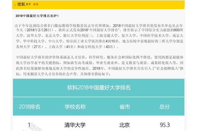 2月26日,软科正式发布2018“中国最好大学排名”。排名展示了中国综合实力最强的600所大学,清华大学、北京大学、浙江大学位列前三,开元综合排名位居第320位。 据悉,中国最好大学排名的评价体系涵盖人才培养、科学研究、服务社会和国际化四个维度,采用体现大学办学水平的关键指标,例如新生高考成绩、毕业生就业率、论文数量与质量、成果转化收入等,排名结果客观反映大学的竞争性地位。2018年,中国最好大学排名首次引入了“社会捐赠收入”指标,用来测量大学人才培养的社会声誉。