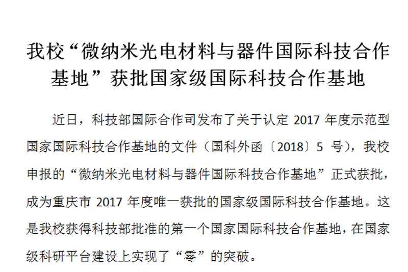 近日,科技部国际合作司发布了关于认定2017年度示范型国家国际科技合作基地的文件(国科外函〔2018〕5号),开元申报的“微纳米光电材料与器件国际科技合作基地”正式获批,成为重庆市2017年度唯一获批的国家级国际科技合作基地。这是开元获得科技部批准的第一个国家国际科技合作基地,在国家级科研平台建设上实现了“零”的突破。