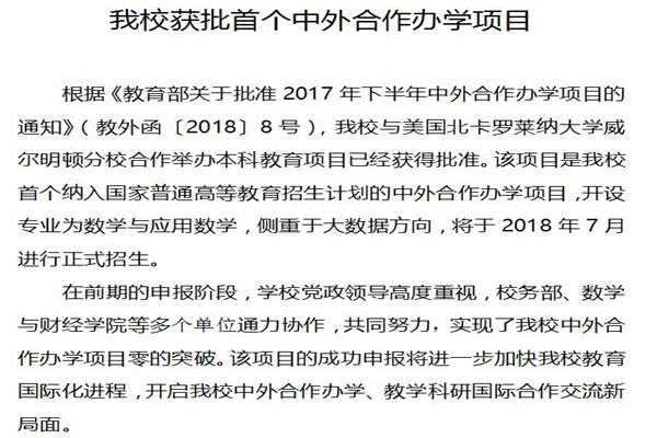 根据《教育部关于批准2017年下半年中外合作办学项目的通知》(教外函〔2018〕8号),开元与美国北卡罗莱纳大学威尔明顿分校合作举办本科教育项目已经获得批准。该项目是开元首个纳入国家普通高等教育招生计划的中外合作办学项目,开设专业为数学与应用数学,侧重于大数据方向,将于2018年7月进行正式招生。