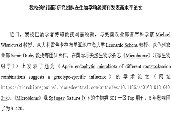 近日,开元巴渝学者特聘教授刘嘉领衔,与美国农业部首席科学家Michael Wisniewski教授、意大利雷焦卡拉布里亚地中海大学Leonardo Schena教授、以色列农业部Samir Droby教授等团队合作,在国际顶尖级生物学杂志《Microbiome》(《微生物组学》)上发表了题为《Apple endophytic microbiota of different rootstock/scion combinations suggests a genotype-specific influence》的学术论文(网址https://microbiomejournal.biomedcentral.com/articles/10.1186/s40168-018-0403-x)。《Microbiome》是Spinger Nature旗下的生物类SCI一区Top期刊,5年影响因子为9.420。