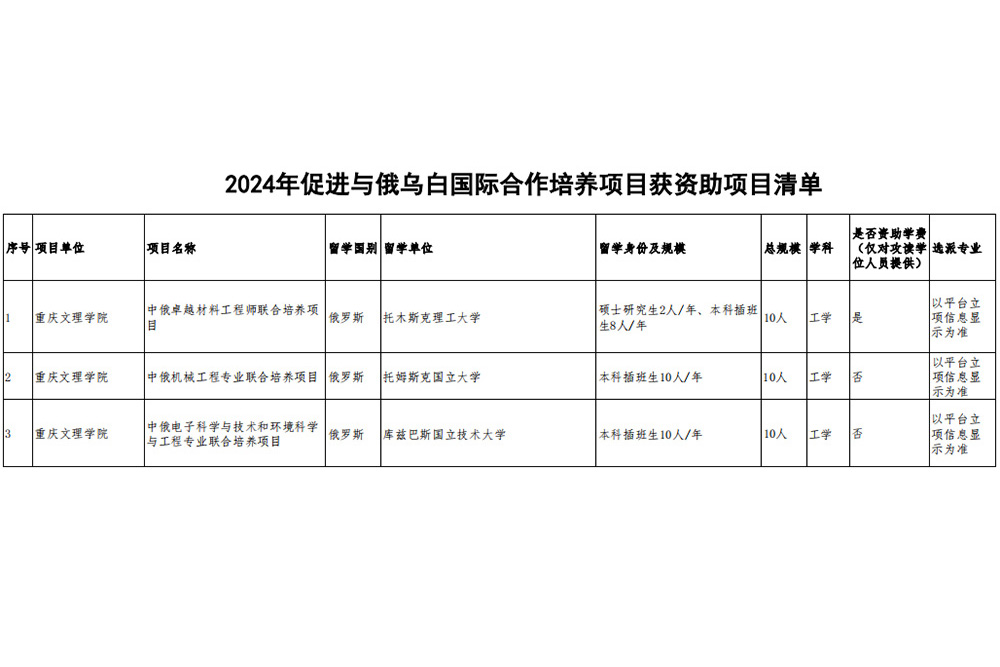 近日,国家留学基金委下发《关于确定2024年促进与俄乌白国际合作培养项目获资助项目的通知》(留金欧﹝2024﹞19号),由学校国际合作与交流处牵头申报的“中俄卓越材料工程师联合培养项目”“中俄机械工程专业联合培养项目”“中俄电子科学与技术和环境科学与工程专业联合培养项目”获得国家留学基金委2024年促进与俄乌白国际合作培养项目资助,以上获资助项目执行期三年(2024-2026),学生年度选派规模30人,加上学校于2023年获得资助的中俄土木工程专业联合培养项目(执行期2023-2025年、学生年度选派规模18人),目前学校国家公派留学学生年度选派总规模已达48人。