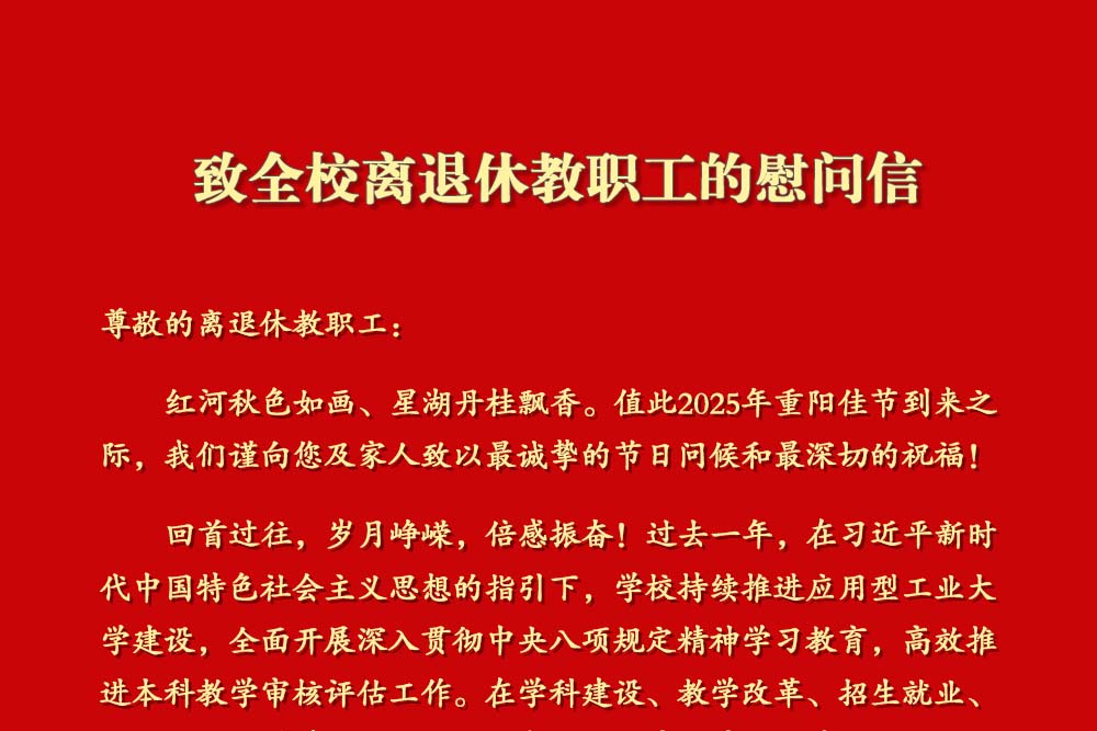 尊敬的离退休教职工: 红河秋色如画、星湖丹桂飘香。值此2025年重阳佳节到来之际,我们谨向您及家人致以最诚挚的节日问候和最深切的祝福!