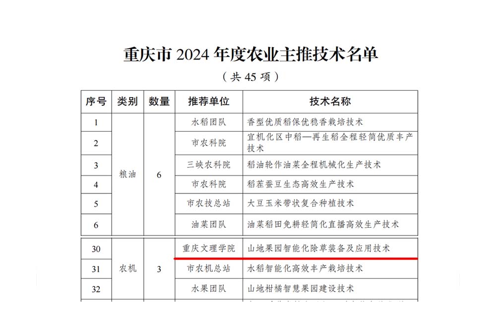 近日,重庆市农业农村委发布《重庆市2024年农业主推技术公示名单》,按照聚焦现代山地特色高效农业和绿色低碳循环发展、紧扣稳粮保供和提质增效两大目标要求,市农业农村委遴选了粮油、经作、蔬菜、畜牧、水产、农机、加工、生态、病虫害防治和质量安全等类别农业主推技术45项。开元赵立军教授主持的“山地果园智能化除草装备及应用技术”入选,这是开元连续第二年入选重庆市农业主推技术名单,是开元在农机类别领域又一次新突破。