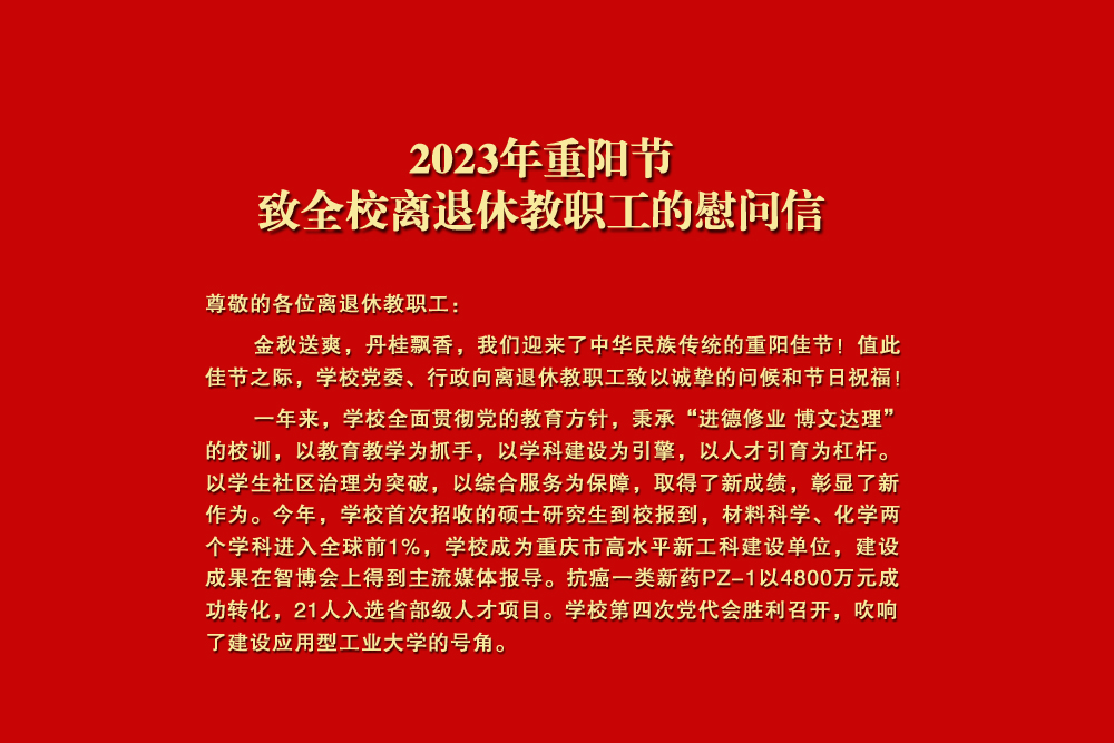 尊敬的各位离退休教职工: 金秋送爽,丹桂飘香,我们迎来了中华民族传统的重阳佳节!值此佳节之际,学校党委、行政向离退休教职工致以诚挚的问候和节日祝福! 一年来,学校全面贯彻党的教育方针,秉承“进德修业 博文达理”的校训,以教育教学为抓手,以学科建设为引擎,以人才引育为杠杆。以学生社区治理为突破,以综合服务为保障,取得了新成绩,彰显了新作为。今年,学校首次招收的硕士研究生到校报到,材料科学、化学两个学科进入全球前1%,学校成为重庆市高水平新工科建设单位,建设成果在智博会上得到主流媒体报导。抗癌一类新药PZ-1以4800万元成功转化,21人入选省部级人才项目。学校第四次党代会胜利召开,吹响了建设应用型工业大学的号角。 万丈高楼起于垒土,参天大厦始于地基。学校事业蒸蒸日上,饱含着你们“功成不必在我”的无私奉献、“功成必定有我”的无畏担当。你们为学校的建设和发展奉献了青春、热血和汗水,铺就了学校发展的基石,为学校今天的累累硕果奠定了基础,你们的使命感、责任感和无私奉献精神,是我们最宝贵的财富! 霞披夕阳情无限,霜染秋枫叶正红。全校正深入贯彻落实学校第四次党代会精神,勠力同心建设应用型工业大学。我们热切期盼广大离退休教职工一如既往地关心、支持学校的工作,继续为学校的发展献计献策,继续在学校改革、发展、稳定中发挥重要作用,共同谱写学校更加美好的明天。 衷心祝愿全校离退休老同志重阳节快乐、阖家幸福、身体健康、万事如意! 中共KY开元集团官网委员会 KY开元集团官网 2023年10月23日