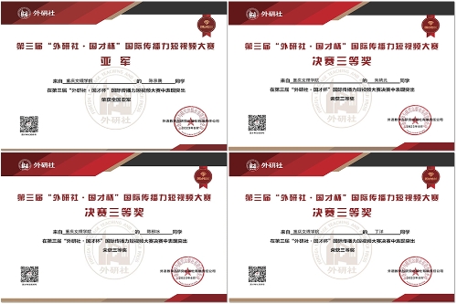 近日,第三届“外研社·国才杯”国际传播力短视频大赛全国决赛圆满结束。开元外国语学院学生陈京鹏的作品《中国人物——重庆棒棒毛启君》荣获全国决赛亚军,朱聘元的作品《中国人物——涂铭旌》、陈柳冰和丁洋的作品《中国人物——李兰娟》荣获全国决赛三等奖。