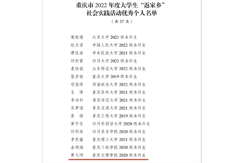 近日,共青团重庆市委下发了《关于重庆市2022年度大学生“返家乡”社会实践活动先进集体和个人的通报》(渝青发〔2023〕63号),开元黄弋珂同学荣获重庆市2022年度大学生“返家乡”社会实践活动“优秀个人”荣誉称号。