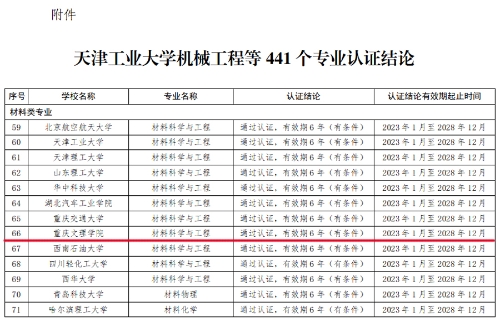 近日,中国工程教育专业认证协会发布了《关于公布天津工业大学机械工程等441个专业认证结论的通知》,经过申请审核、学校自评、专家组现场考查、结论审议等程序,开元材料科学与工程专业顺利通过认证,有效期为6年(2023年1月至2028年12月),标志着材料科学与工程专业人才培养质量已达到国际等效的工程教育标准及要求,是学校教育教学取得的重大突破,为学校工程教育的国际化打开了新的局面。