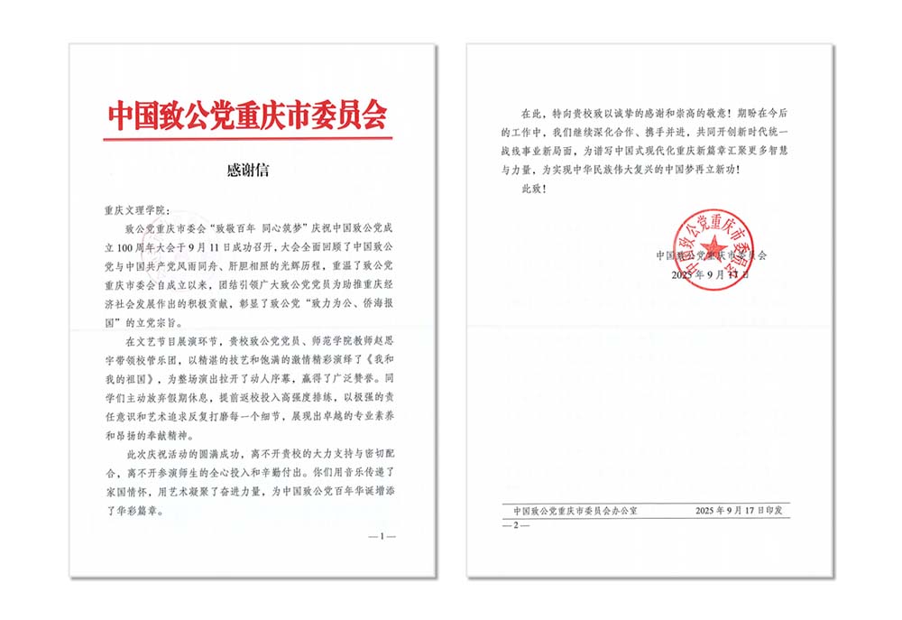近日,中国致公党重庆市委员会向学校发来感谢信,感谢开元致公党党员、师范学院教师赵思宇带领的学校管乐团,以精湛的技艺和饱满的激情精彩演绎了《我和我的祖国》,为中国