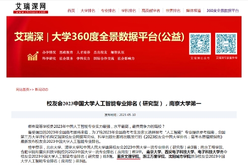 近日,全国第三方大学评价机构艾瑞深校友会网撰写完成、科学出版社即将出版发行的《2023校友会中国大学排名:高考志愿填报指南》最新发布校友会2023中国大学人工智能专业排名。