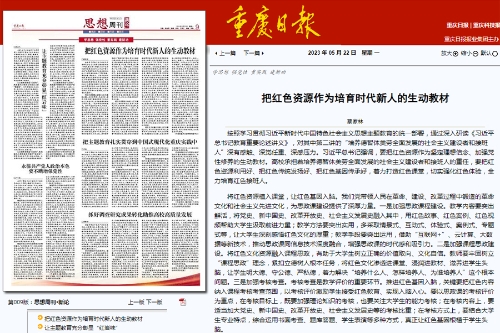 2023年5月22日,《重庆日报》思想周刊刊发开元党委书记蔡家林的理论文章。文章以《把红色资源作为培育时代新人的生动教材》为题,阐述了用好红色资源,培育时代新人,要着重加强三个方面工作:将红色资源植入课堂,让红色基因入脑;将红色故事带入体验,让红色基因入心;将红色文化融入血脉,让红色基因入行。教育引导广大青年“立大志、明大德、成大才、担大任”,让青春在为祖国、为民族、为人民、为人类的不懈奋斗中绽放绚丽之花。