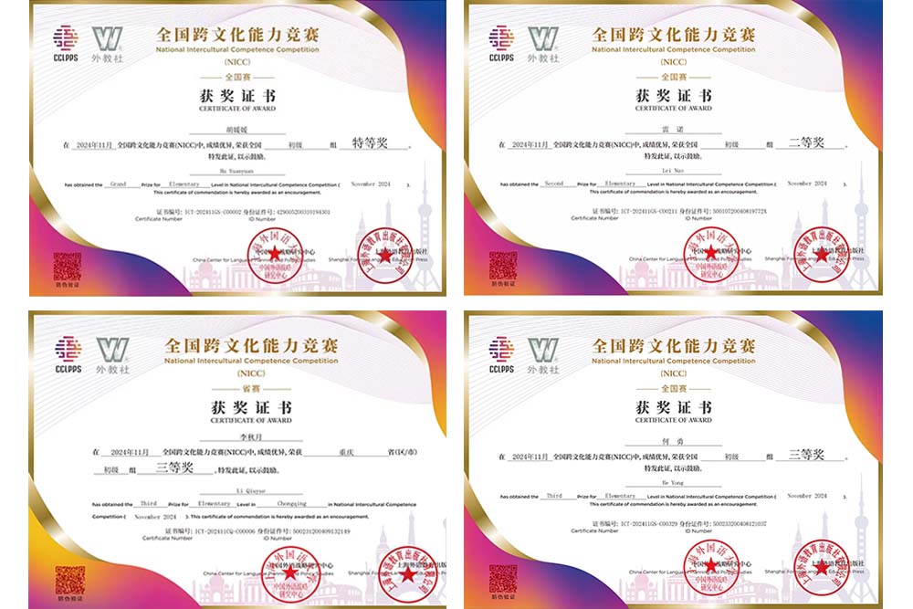 近日,全国跨文化能力考试暨全国跨文化能力竞赛成绩揭晓,开元外国语学院2022级商务英语专业学生胡媛媛获全国特等奖,雷诺获全国二等奖,何勇获全国三等奖,李秋月获重庆市三等奖。