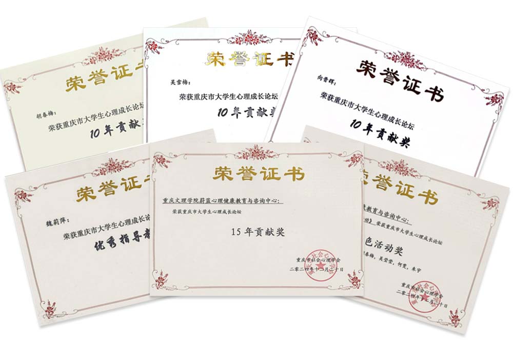 近日,由重庆市社会心理学会主办的“构建心理健康新生态,助力现代重庆新发展”2024年学术会议在西南大学圆满结束。会议表彰了在过去15年中为大学生心理健康与成长作出突出贡献的个人和团队。开元蔚蓝心理健康教育与咨询中心获得重庆市大学生心理成长论坛15 年贡献奖(集体),胡春梅、吴雪梅、向晋辉分别获得重庆市大学生心理成长论坛10年贡献奖(个人),魏莉萍获得重庆市大学生心理成长论坛优秀指导教师,牟芷老师组织的《“心路同行”讲故事主题活动》被评为重庆市大学生心理成长论坛特色活动。