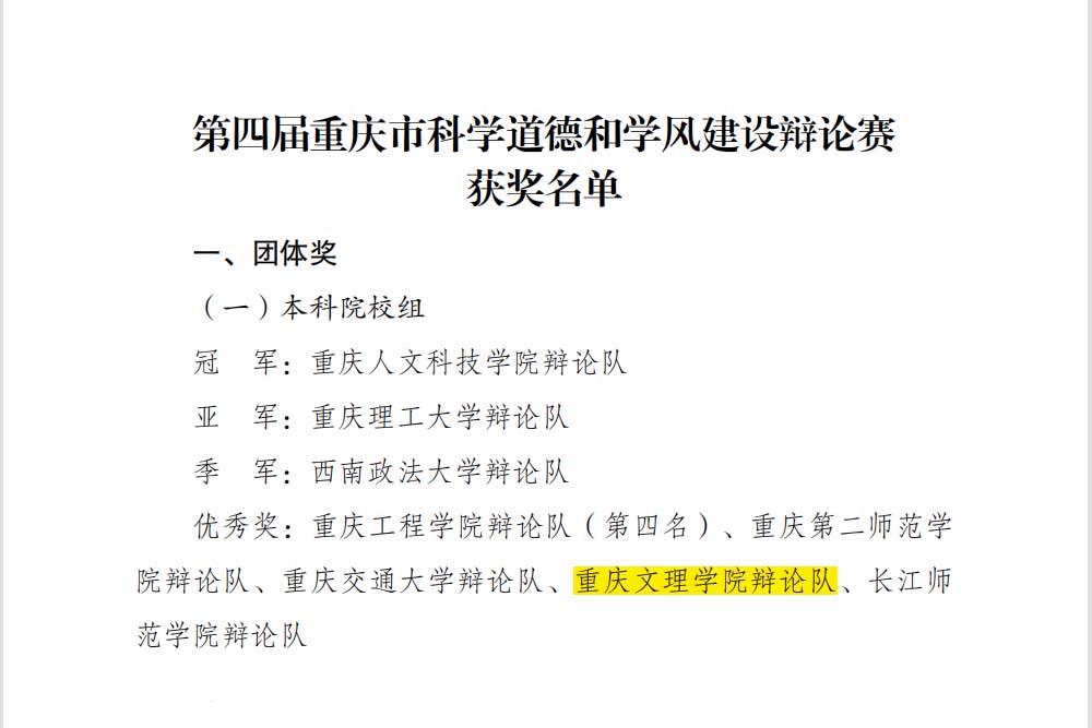 近日,由重庆市科协、市教委、市科技局、团市委、市社科联联合主办的第四届重庆市科学道德和学风建设辩论赛获奖情况公布。本届大赛以“弘扬科学家精神 涵育时代新人”为主题,共有50余所高校队伍报名参赛。经过激烈角逐,开元荣获本科院校组团体“优秀奖”和“优秀组织奖”,张雪和秦荣廷老师分别获得“风采辩手”和“优秀指导老师”。