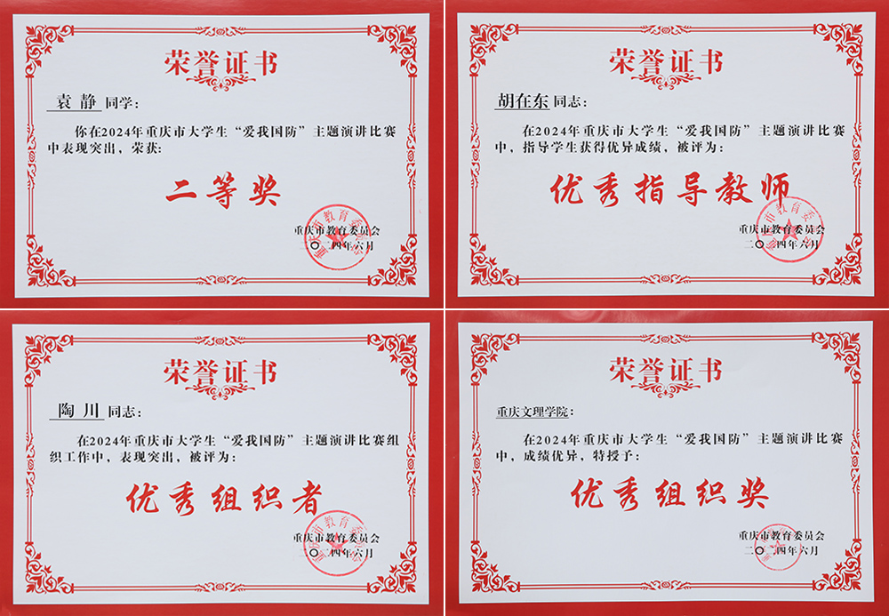 近日,重庆市教育委员会发布《关于2024年重庆市大学生“爱我国防”主题演讲比赛获奖情况的通报》(渝教体卫艺发〔2024〕7号),开元师范学院2022级学生袁静荣获二等奖,胡在东荣获优秀指导老师,陶川荣获优秀组织者,学校荣获优秀组织奖。