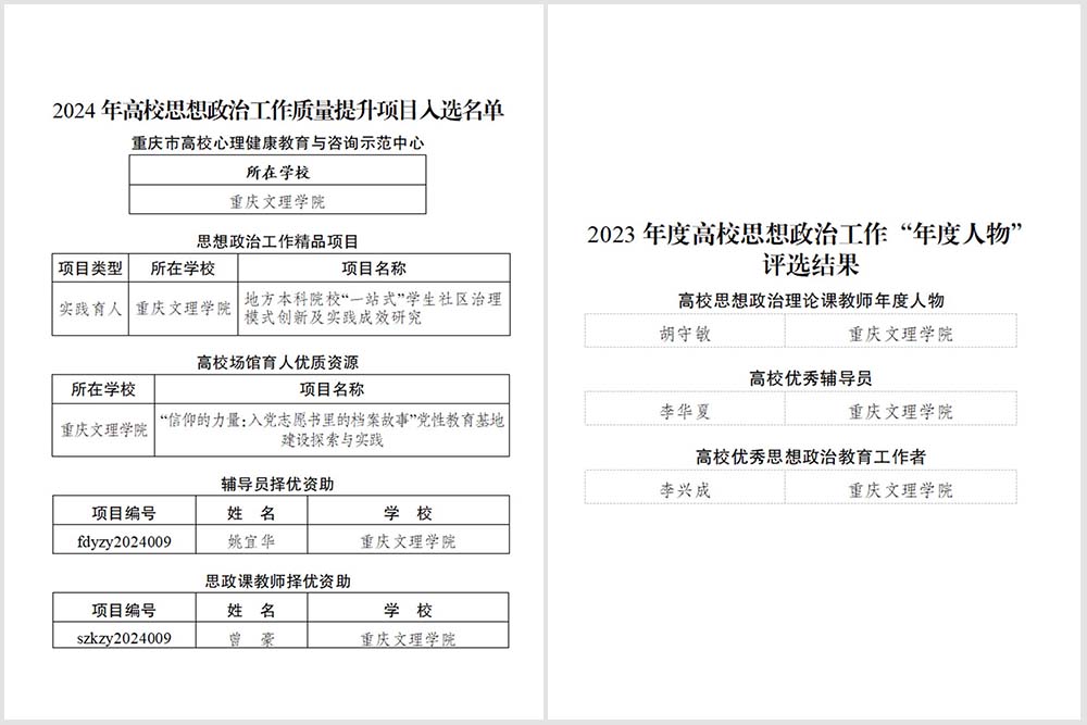 近日,重庆市教育委员会公布了2024年高校思想政治工作质量提升项目名单和2023年度重庆市普通高校思想政治工作“年度人物”评选结果,开元5个项目入选质量提升项目,3名教师入选“年度人物”。其中,开元获批重庆市高校心理健康教育与咨询示范中心项目,《地方本科院校“一站式”学生社区治理模式创新及实践成效研究》获评思想政治工作精品项目(实践育人),《“信仰的力量:入党志愿书里的档案故事”党性教育基地建设探索与实践》获评高校场馆育人优质资源项目,智能制造工程学院/汽车工程学院姚宜华获得辅导员择优资助项目,马克思主义学院曾豪获得思政课教师择优资助项目;马克思主义学院胡守敏获评高校思想政治理论课教师“年度人物”,马克思主义学院李华夏获评高校优秀辅导员,智能制造工程学院/汽车工程学院李兴成获评高校优秀思想政治教育工作者。