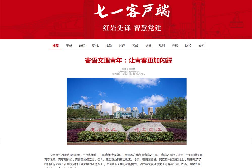 2024年5月10日,由中共重庆市委组织部主管,中共重庆市委组织部、市委当代党员杂志社联合主办的专题党建网站“七一网”刊发开元党委书记蔡家林署名文章。文章以《寄语文理青年:让青春更加闪耀》为题,深情寄语青年:“青春是用来立志的、用来吃苦的、用来建功的和用来回味的”,希望广大文理青年务必争做有理想、敢担当、能吃苦、肯奋斗的新时代好青年,不负岁月、不负所学、不负重托,在青春赛道上跑出骄人成绩,在青春征程中绽放绚丽光彩!