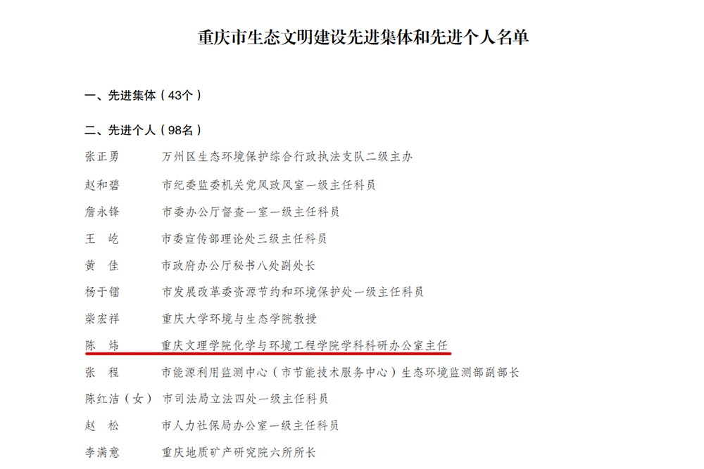 近日,重庆市人民政府印发《重庆市人民政府关于表彰重庆市生态文明建设先进集体和先进个人的决定》(渝府发﹝2024﹞3号)文件,开元化学与环境工程学院陈炜博士荣获“重庆市生态文明建设先进个人”荣誉称号。