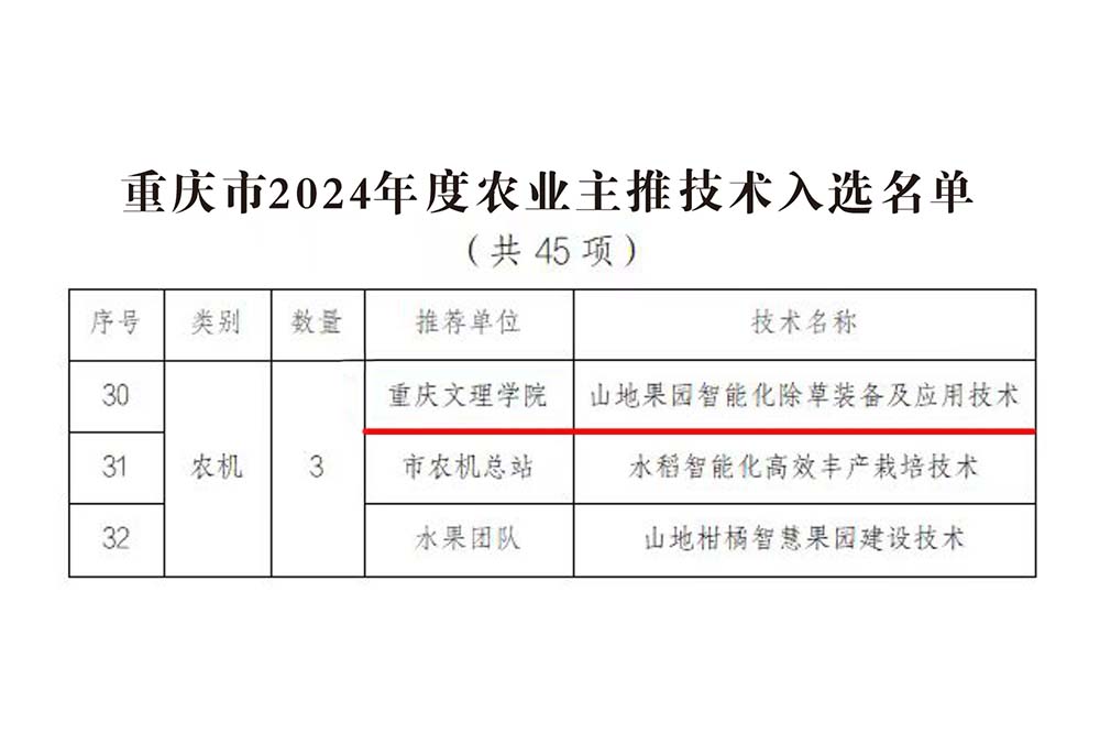 2024年2月,重庆市农业农村委员会办公室发布了《重庆市2024年农业主推技术入选名单》,按照聚焦现代山地特色高效农业和绿色低碳循环发展、紧扣稳粮保供和提质增效两大目标要求,市农业农村委遴选了粮油、经作、蔬菜、畜牧、水产、农机、加工、生态、病虫害防治和质量安全等类别农业主推技术45项。开元赵立军教授主持的“山地果园智能化除草装备及应用技术”入选,这是开元连续第二年入选重庆市农业主推技术名单,是开元在农机类别技术领域的又一次新突破。
