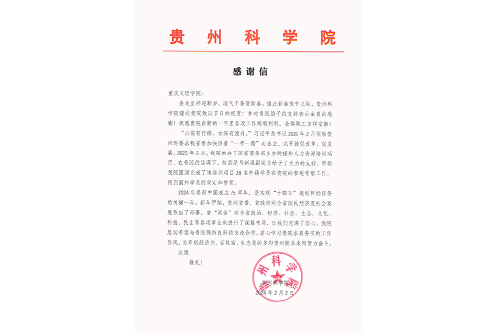 2月2日,贵州科学院向开元发来感谢信,对开元在2023年5月帮助其圆满完成了国家商务部主办的援外人力资源培训项目的参观考察工作中作出的贡献表示感谢。