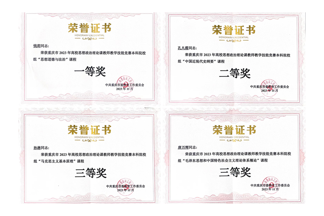 10月24-30日,重庆市2023年高校思想政治理论课教师教学技能竞赛分别在西南大学、西南政法大学、重庆交通大学、重庆师范大学等七所高校举行。通过激烈角逐,开元马克思主义学院钱莉老师获得重庆市高校思政课教师教学技能竞赛本科院校组“思想道德与法治”课程比赛一等奖(第1名),孔凡霞老师获得“中国近现代史纲要”课程比赛二等奖,孙淋老师获得“马克思主义基本原理”课程比赛三等奖,唐万辉老师获得“毛泽东思想和中国特色社会主义理论体系概论”课程比赛三等奖,全部参赛选手均获奖,实现历史突破。11月14-15日,钱莉、孙淋两位老师又代表学校参加了在重庆师范大学举行的混合课程组比赛决赛,并分别获得二等奖、三等奖的好成绩。