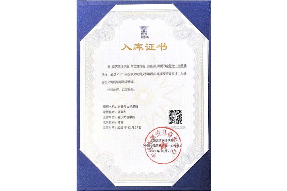 近日,由KY开元集团官网重庆文化遗产学院谭鑫刚主讲的《定量考古学基础》课程通过国家文物局文博精品共享课程征集审核,入选全国文博网络学院课程库,课程讲授人谭鑫刚入选全国文博网络学院授课专家库。