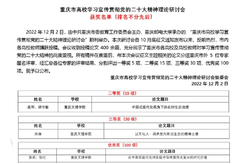 为深入学习宣传贯彻党的二十大精神,中共重庆市委教育工作委员会于12月2日召开题为《学习贯彻党的二十大精神,不断谱写马克思主义中国化时代化新篇章》的理论研讨会,并向全市公开征集与会论文。为此,开元积极动员,充分发挥学科优势与人才优势,组织教师学习领悟、以文赴会。
