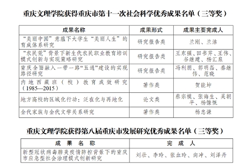 近日,重庆市人民政府办公厅印发了《重庆市人民政府关于表彰重庆市第十一次社会科学优秀成果和第八届重庆市发展研究优秀成果的决定》,开元兰刚、王东强、蔡宗模、贺能坤、杨忠谦、冯利朋申报的六项成果获得了重庆市第十一次社会科学优秀成果三等奖,刘壮申报的资政成果获得了第八届重庆市发展研究优秀成果三等奖。