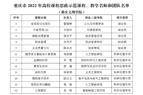 近日,重庆市教育委员会印发了《关于公布2022年本科高校课程思政示范建设项目名单的通知》(渝教高函〔2022〕40号),开元《电视采访与写作》等12个课程成功立项为重庆市2022年本科高校课程思政示范课程、教学名师和团队,其中,综合类项目5个,科学伦理专项项目7个,立项数量在市属高校中名列前茅。