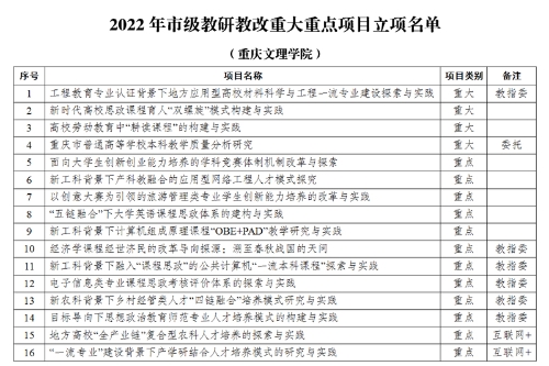 近日,重庆市教育委员会印发《关于公布2022年高等教育教学改革研究项目评选结果的通知》(渝教高函〔2022〕47号),开元共获批42个项目,其中4项获批重大项目、12项获批重点项目、26项获批一般项目。重大重点项目数位居市属本科高校第二。
