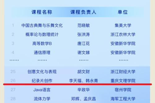 近日,教育部在线教育研究中心公布了2022年“拓金计划”示范课程入选名单,开元李天福教授和韩永青教授为负责人的国家级一流本科课程《纪录片创作》成功入选,成为重庆市高校第2门入选该计划的课程。