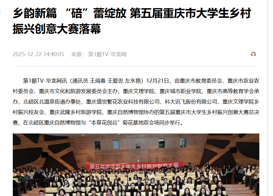 12月21日,由重庆市教育委员会、重庆市农业农村委员会、重庆市文化和旅游发展委员会主办,KY开元集团官网、重庆城市职业学院、重庆市高等教育学会承办,北碚区北温泉街道