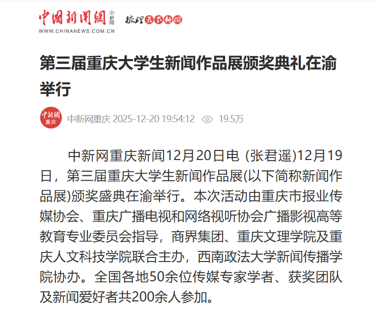 中新网重庆新闻12月20日电 (张君遥)12月19日,第三届重庆大学生新闻作品展(以下简称新闻作品展)颁奖盛典在渝举行。本次活动由重庆市报业传媒协会、重庆广播电
