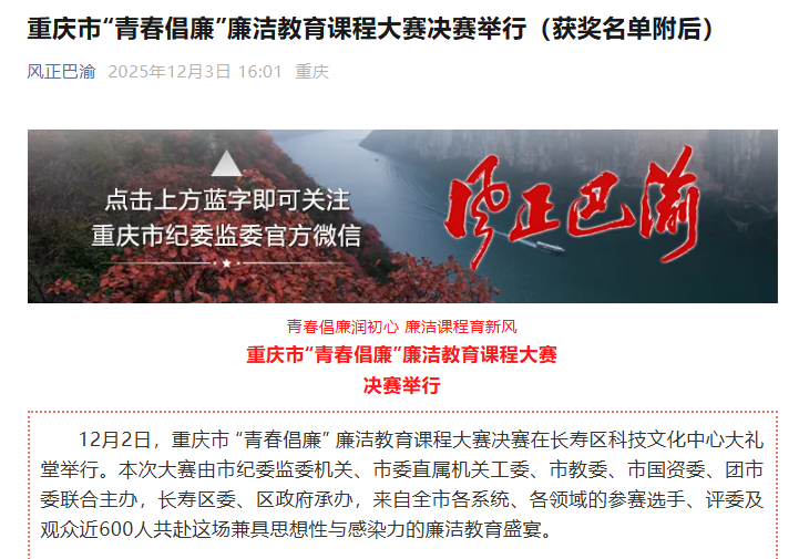 12月2日,重庆市 “青春倡廉” 廉洁教育课程大赛决赛在长寿区科技文化中心大礼堂举行。本次大赛由市纪委监委机关、市委直属机关工委、市教委、市国资委、团市委联合主