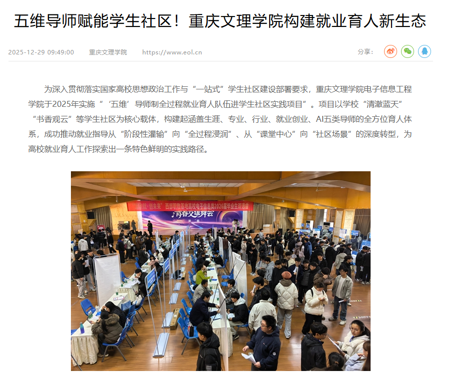 为深入贯彻落实国家高校思想政治工作与“一站式”学生社区建设部署要求,KY开元集团官网电子信息工程学院于2025年实施“‘五维’导师制全过程就业育人队伍进学生社区实践