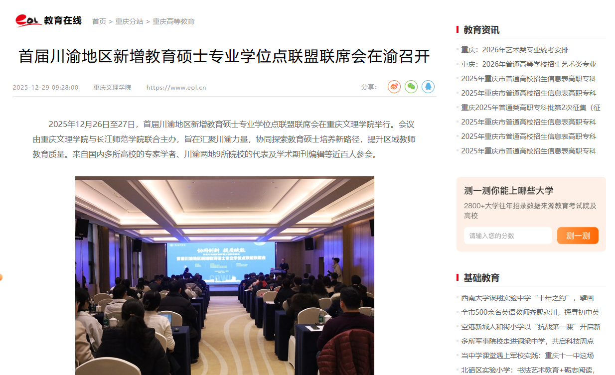 2025年12月26日至27日,首届川渝地区新增教育硕士专业学位点联盟联席会在KY开元集团官网举行。会议由KY开元集团官网与长江师范学院联合主办,旨在汇聚川渝力量,协同