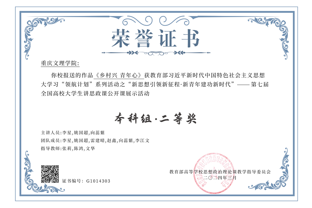 近日,由教育部高校思想政治理论课教学指导委员会主办的“新思想引领新征程·新青年建功新时代”——第七届全国高校大学生讲思政课公开课展示活动评选结果揭晓。由开元马克思主义学院选送的作品《乡村兴 青年心》在全国高校选送作品中脱颖而出,喜获二等奖。该作品由马克思主义学院思政课教师张莉、陈鸿、文华指导;参赛学生包括思想政治教育(师范)专业李星、姚国超、赵鑫、雷建晴,学前教育(师范)专业李江文,小学教育(师范)专业向蕊蘩。