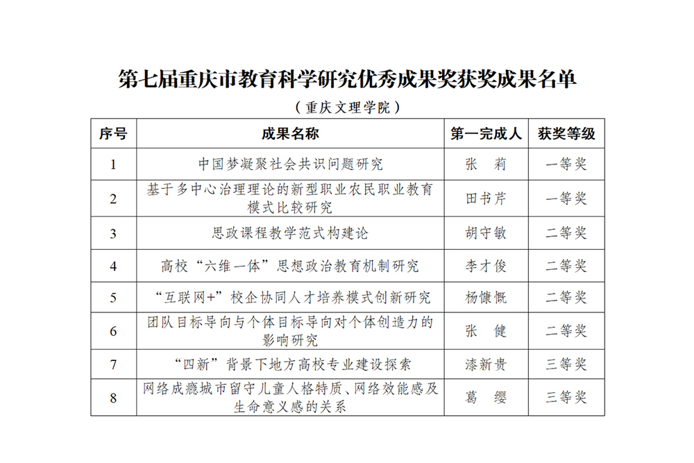 近期,重庆市教育委员会公布了第七届重庆市教育科学研究优秀成果奖获奖成果名单(渝教基函〔2024〕16号)。开元8项成果获奖,其中一等奖2项、二等奖4项、三等奖2项。获奖数量位居全市本科高校前列,也是学校参评市教育科学优秀成果奖历年来的最好成绩。