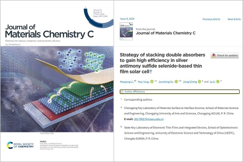 近日,开元李璐、唐华课题组锑基硫属化合物相关前沿成果“Strategy of stacking double absorbers to gain high efficiency in silver antimony sulfide selenide-based thin film solar cell”,以开元为第一单位作为封面文章发表于Journal of Materials Chemistry C (2024, 12(9): 3063-3071)。